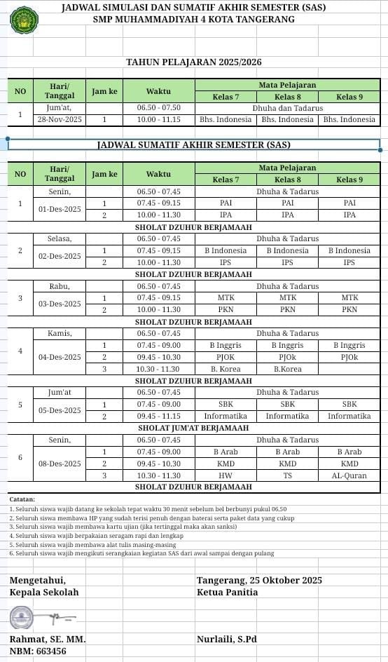 76 pelajar SMP Muhammdiyah 4 Tangerang melakukan wisuda setelah dinyatakan lulus tahfidz Juz 29 dan 30. Pada tanggal 25 Februari 2024 jam 08.00 s/d 12.00.wib Proses wisuda yang berlangsung di halaman komplek Pendidikan perguruan Muhammadiyah cipondoh itu mengundang haru.